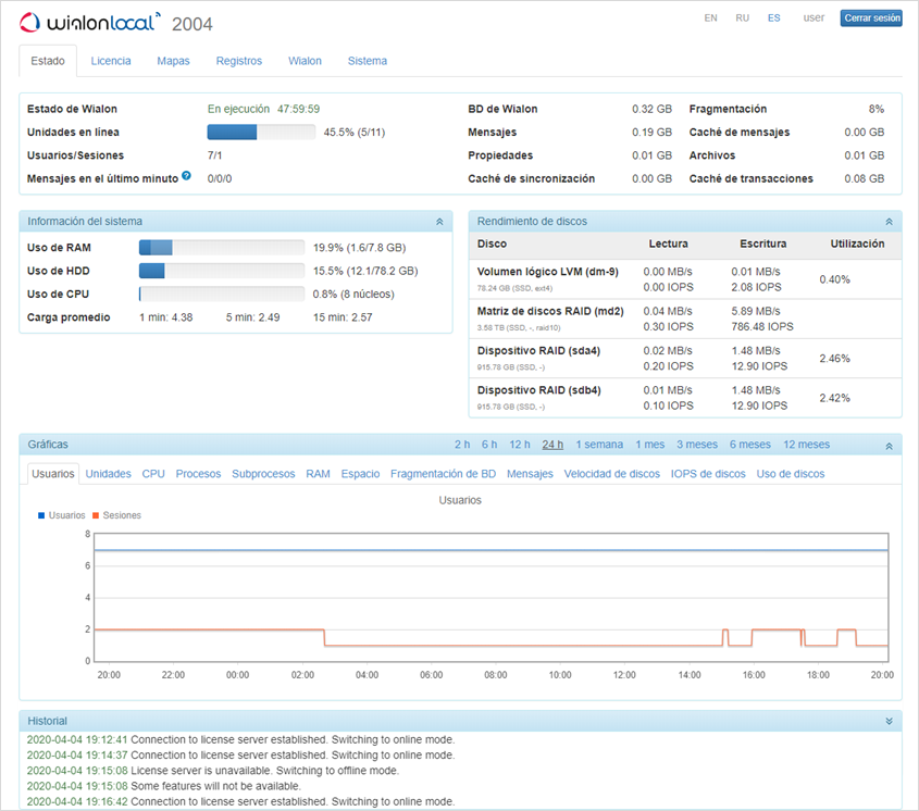 En la pestaña Estado se muestra información sobre los parámetros principales del funcionamiento del servicio en tiempo real.