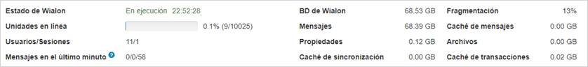 | Estado de Wialon | Es el estado actual de Wialon Local: en ejecución o detenido. Para el estado En ejecución se muestra su duración en el formato horas:minutos:segundos. |