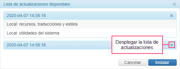 Para instalar las actualizaciones disponibles, apriete Instalar. Se puede ver actualizaciones disponibles en la ventana Lista de actualizaciones disponibles (enlace Disponibles).
