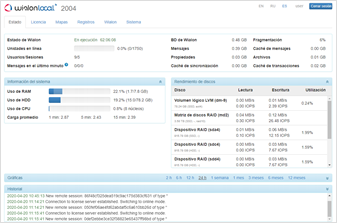 El sistema de administración de Wialon Local permite iniciar y detener Wialon, seguir su funcionamiento, errores, consumo de memoria y carga de CPU, etc.