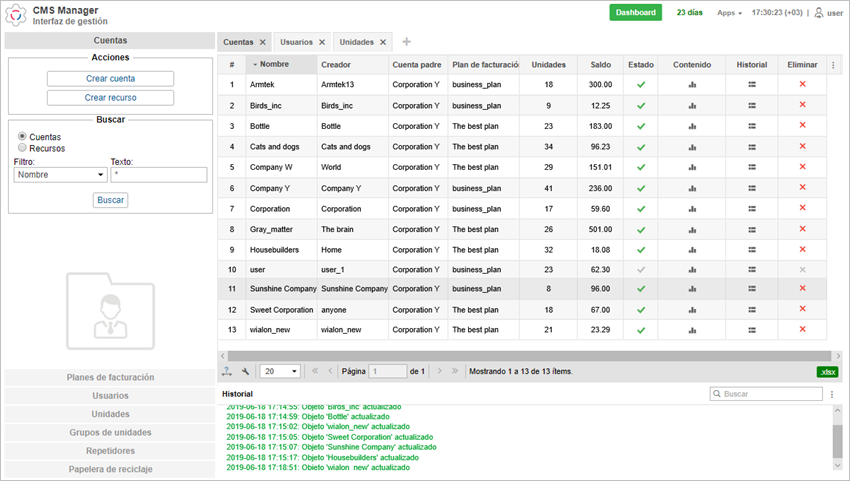 La gestión del sistema de rastreo satelital Wialon se realiza en la interfaz especializada CMS Manager. Esta interfaz ha sido elaborada para los mánager de Wialon. CMS Manager permite manejar su sistema de rastreo por medio de tales macroobjetos suyos como cuentas (recursos), planes de facturación, usuarios, unidades, repetidores y otros.