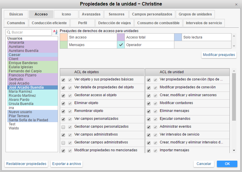 Los preajustes pueden facilitar y acelerar la configuración de los derechos de acceso. Usted puede crear varios conjuntos de derechos para varios propósitos. Pueden ser accesos para operadores, mánager, clientes, etc. Además, se puede crear preajustes para cada tipo de objeto (unidad, ruta, etc). Los preajustes creados se aplican a los usuarios elegidos por un clic del ratón.