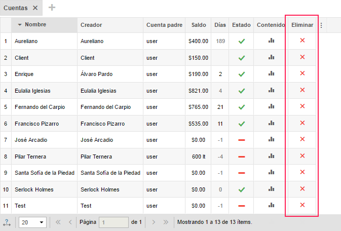 Para eliminar una cuenta o un recurso hay que tener derechos de acceso correspondientes. La eliminación se realiza más a menudo al terminarse la prestación de servicios a un cliente.