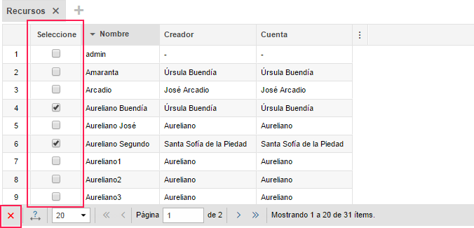 Para eliminar un recurso márquelo con visto en la primera columna y apriete el botón