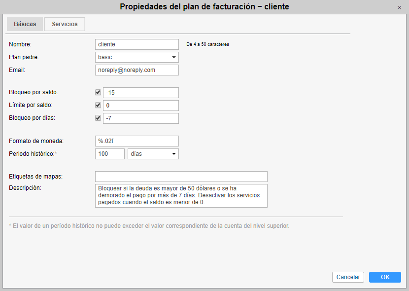 Indique el saldo (la cantidad de dinero en las cuentas) al alcanzar el cual las cuentas con este plan de facturación no podrán acceder a los sitios.