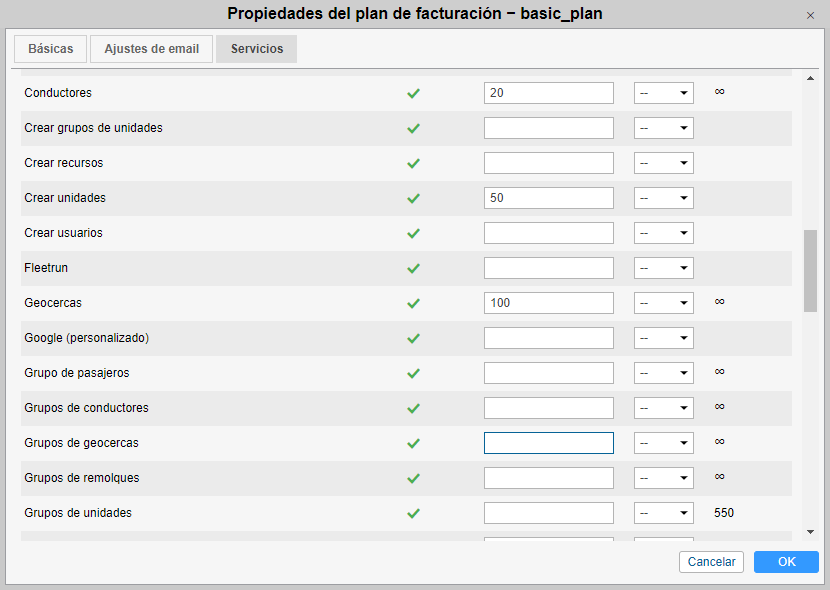 La cantidad y precio se ajustan de la misma manera que en la pestaña análoga de las propiedades de cuenta. Sin embargo, hay algunas diferencias. Por ejemplo, la columna Límite muestra la cantidad máxima posible del servicio de acuerdo con las restricciones de la cuenta del nivel superior.