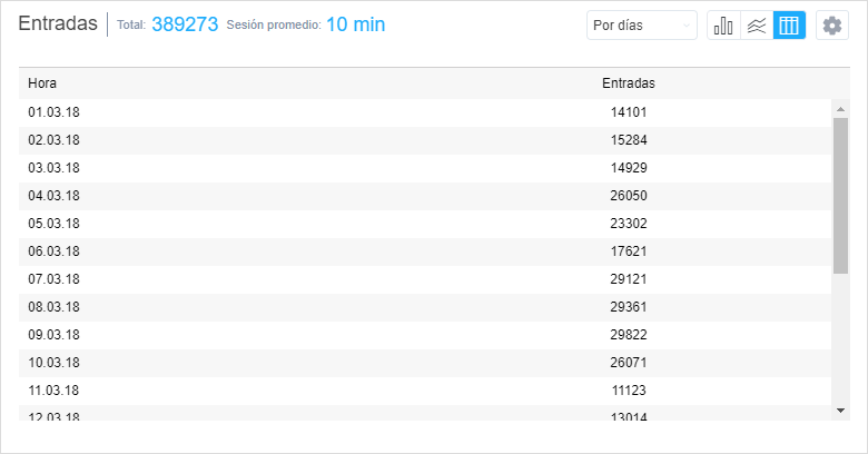 Los datos del gráfico pueden mostrasre en forma de un gráfico de barras, un gráfico de líneas o una tabla y agruparse por días, semanas/meses/trimestres.