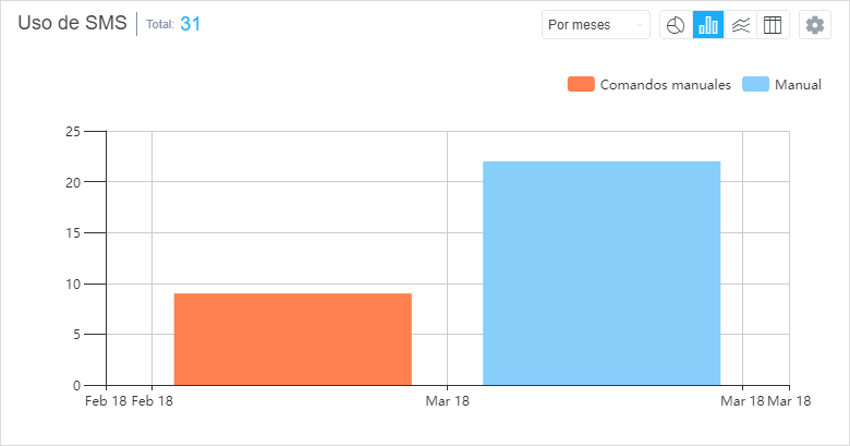 Los datos sobre el modo de envío de SMS pueden mostrarse en forma de un gráfico de círculo, un gráfico de barras, un gráfico de líneas o una tabla.