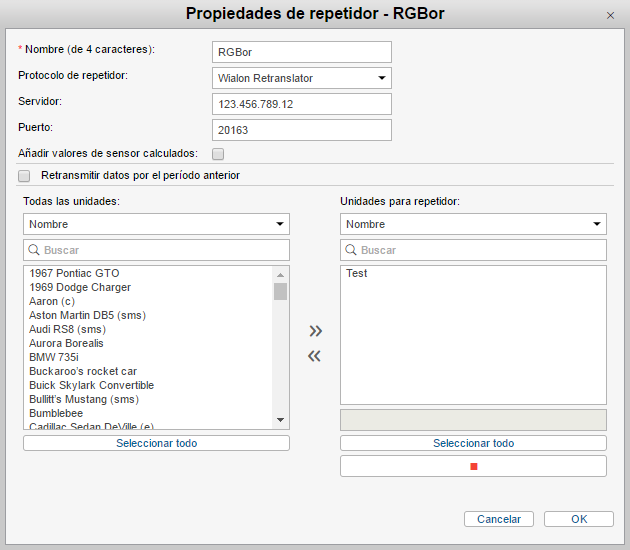 Abajo está la lista de unidades disponibles. Para mayor comodidad se puede utilizar el filtro dinámico. Este filtro no solo funciona por nombre, sino por número de teléfono, ID único, tipo de dispositivo, campos personalizados, etc. Una vez encontradas las unidades necesarias, muévalas a la parte derecha por medio de un doble clic del ratón o por medio del botón Agregar (flechas hacia derecha). También se puede aplicar el filtro dinámico a la lista de unidades para repetidor (por nombre, ID redefinido). Para borrar las unidades de la lista de retransmisión, muévalas de la lista derecha a la izquierda por medio del botón Borrar (flechas hacia izquierda). Además, cuando se escogen las unidades para un repetidor se puede adjudicarlas nuevos ID. Para la repetición por el protocolo Granit Navigator el ID de la unidad tiene que ser un número de 0 a 65535.