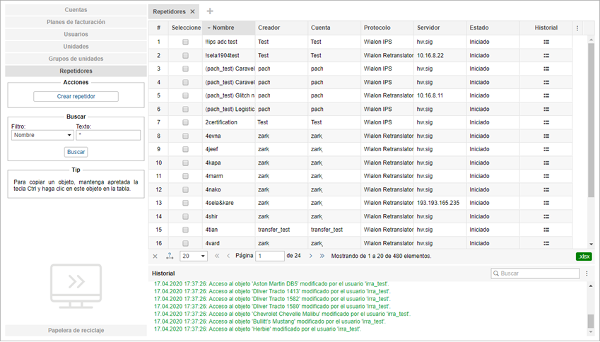 En la tabla de resultados se muestra el nombre del repetidor, su creador (siempre es el usuario-mánager bajo cuyo nombre del usuario fue creado el repetidor), protocolo, servidor, estado y los iconos de iniciar/parar la repetición y de eliminar los repetidores mismos, así como un icono para abrir el historial. Haga clic en un repetidor para ver sus propiedades, agregar o eliminar unidades, iniciar o pararlo o para modificar o revisar otros parámetros suyos.