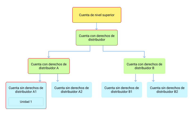 Se recomienda tener al menos tres niveles en la jerarquía: cuenta de nivel superior, cuenta con derechos de distribuidor y cuenta sin derechos de distribuidor. Dependiendo de las particularidades de su negocio, puede ser necesaria una estructura del servicio más profunda y ramificada.