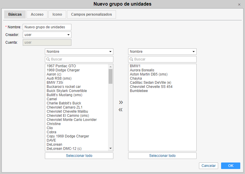 En la parte izquierda se muestra la lista de todas las unidades disponibles; en la parte derecha, las unidades que forman el grupo. Para mayor comodidad se puede utilizar el filtro dinámico. Este filtro no solo funciona por nombre, sino por número de teléfono, ID único, tipo de dispositivo, características, etc. Para agregar la unidad necesaria al grupo, muévala a la parte derecha por medio de un doble clic del ratón o por medio del botón Agregar. Para excluir una unidad del grupo, haga doble clic en su nombre en la lista de la derecha o selecciónela y apriete el botón Eliminar.