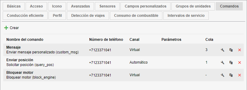 La lista de comandos contiene la siguiente información: el nombre del comando, el número de teléfono y el canal usados para su envío, parámetros y la cantidad de comandos en la cola. Al apuntar a la cola con el cursor, aparece un icono para limpiarla. Al final de cada línea están los iconos para configurar, copiar y eliminar comandos.