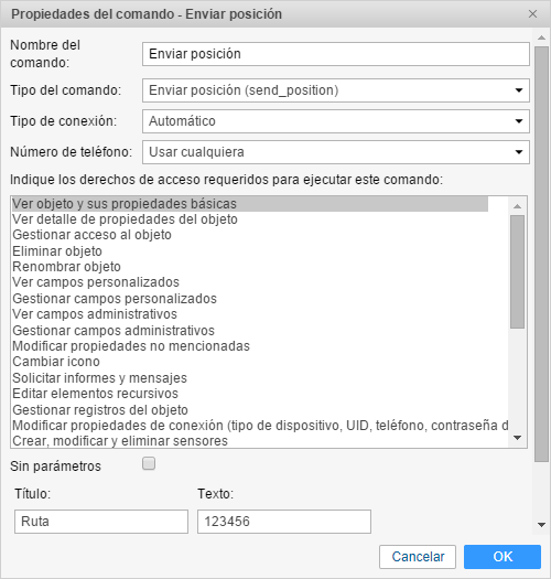 Para gestionar los comandos, para la cuenta debe estar activado el servicio Comandos. El usuario necesita los derechos de acceso Ver comandos y Crear, modificar y eliminar comandos en relación a la unidad a la que se envía el comando.