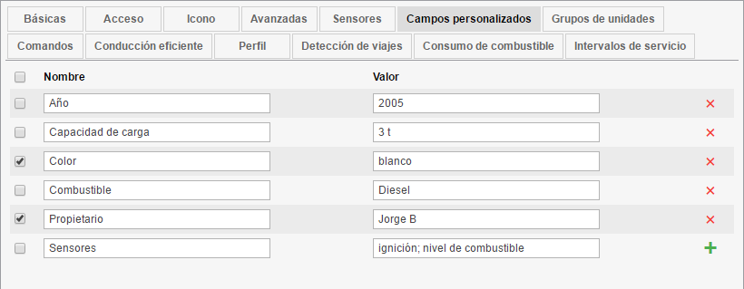 En la pestaña Campos personalizados del diálogo de propiedades de unidad se puede crear campos que reflejarán información adicional de la unidad. Pueden ser, por ejemplo, tipo de combustible, año, capacidad de carga, etc. Además, en función de información adicional se puede introducir en estos campos enlaces a recursos externos. Se puede marcar una parte de estos campos como administrativos (botón-visto frente al campo) y se harán invisibles para los usuarios que no tengan derechos correspondientes.