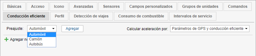 La pestaña Conducción eficiente es un formulario donde hay que introducir los parámetros utilizados mientras calcular los puntos. Para agregar los criterios de la conducción eficiente se puede escoger entre dos opciones: utilizar un criterio predeterminado de una de las plantillas disponibles o configurar su propio.