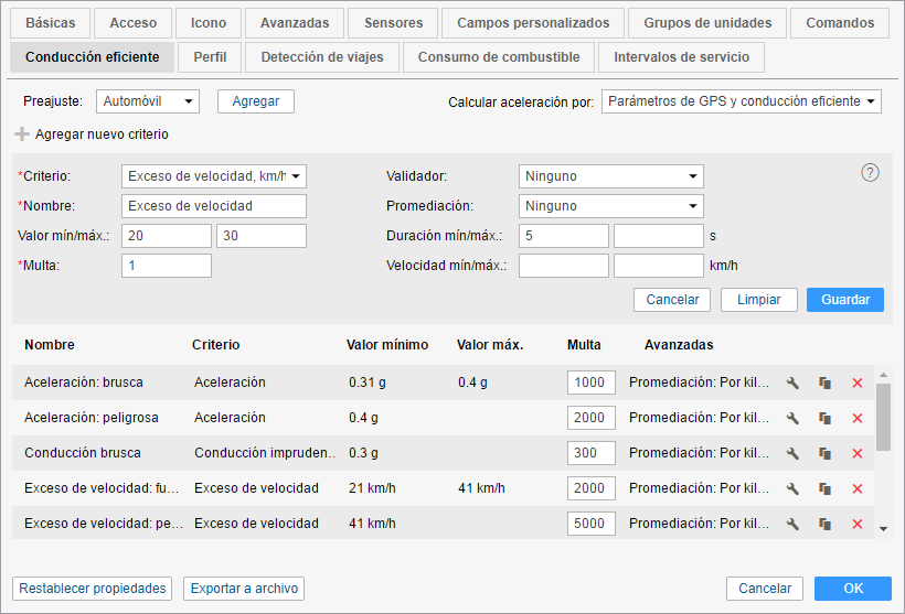 En los campos correspondientes se ajustan los valores de exceso (mínimo — máximo) en km/h, que se fijarán como una infracción y los puntos de multa que se cargarán por esta infracción. Además, en función de parámetros adicionales se puede indicar validador (multiplicador), promediación, duración máxima/mínima y velocidad máxima/mínima en que se fijará la violación. Mientras estimar la calidad de conducción los excesos de velocidad se determinan de acuerdo con los límites de carreteras (a condición de que la restricción de carretera sea superior a 30 km/h). Sin embargo, en los criterios adicionales se puede indicar la velocidad mínima/máxima de fijar la infracción.