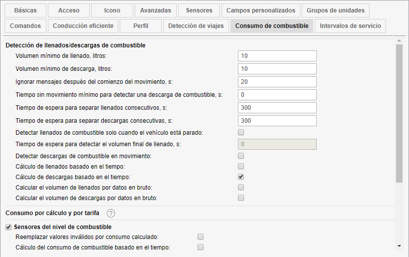 La detección de llenados/descargas de combustible solo está disponible en caso de tener la unidad sensores del nivel de combustible y el visto activado en la opción Sensores del nivel de combustible. El cálculo del consumo de combustible se realiza si hay sensores del consumo de combustible. La exactitud de detección depende directamente de la precisión de los sensores instalados y de su configuración correcta. Durante los cálculos se utilizan los parámetros configurados en esta pestaña. Estos parámetros están divididos en tres secciones.