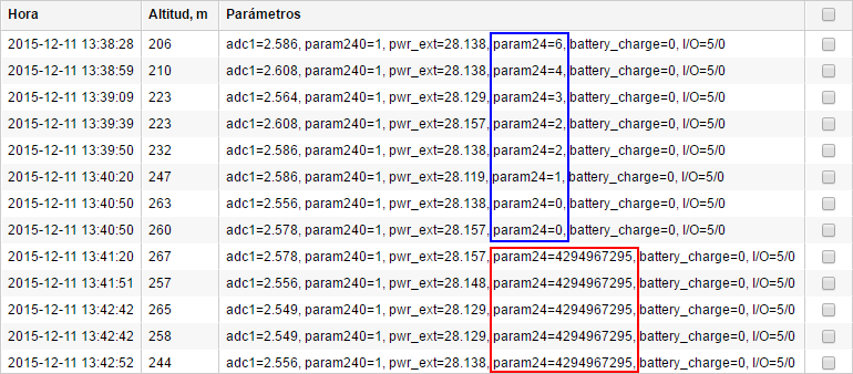 Abre la pestaña Mensajes y solicite mensajes por un intervalo. Active la opción Mostrar parámetros como datos sin procesar. Encuentre en la columna Parámetros el que le interesa y analice los datos que vienen en este parámetro. En nuestro caso será el parámetro de temperatura param24.