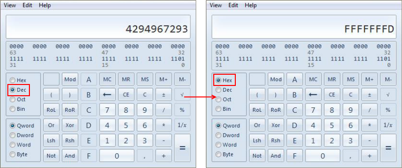 Primeramente hay que determinar el límite máximo de estos números. Para hacerlo, tome cualquier número inverosímilmente grande de los valores del parámetro e introdúzcalo en la calculadora en el modo decimal (Dec). Luego cambie por el modo hexadecimal (Hex).
