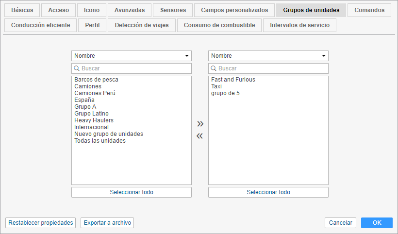 A la izquierda está la lista de grupos existentes; y a la derecha, solo los grupos a que pertenece dada unidad. Utilice los botones Agregar/Eliminar para incluir una unidad en un grupo o excluirla de este.