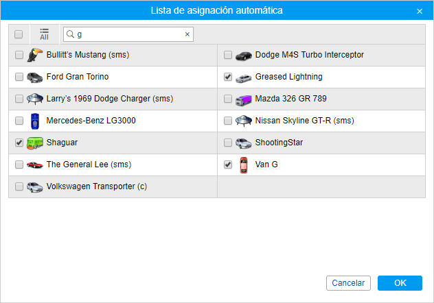 2. Formar listas de asignación automática de conductores. Apriete el botón de asignación automática en el Panel de conductores () y cree para cada recurso su lista de unidades, a que pueden asignarse los conductores de la lista automáticamente.