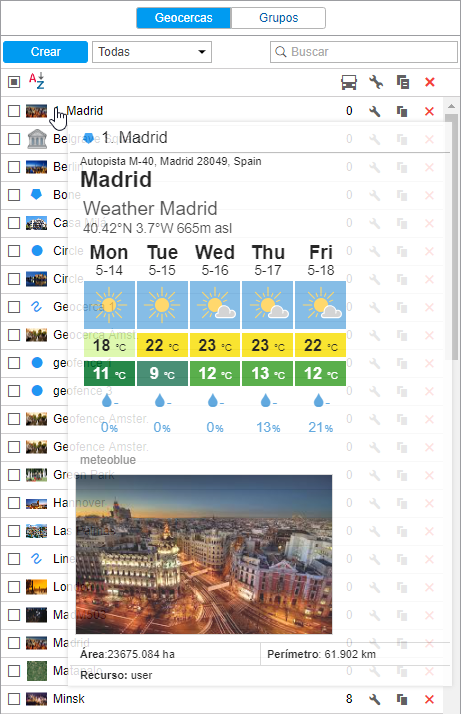 - el recurso al que pertenece la geocerca (si el usuario actual tiene acceso a varios);