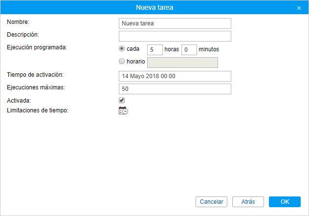 Se puede indicar la periodicidad (intervalo) de ejecución — cada número de horas horas y número de minutos minutos.