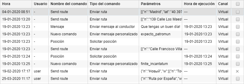 Canal — el tipo de conexión que se ha empleado para ejecutar el comando (TCP, UDP, Virtual, SMS).