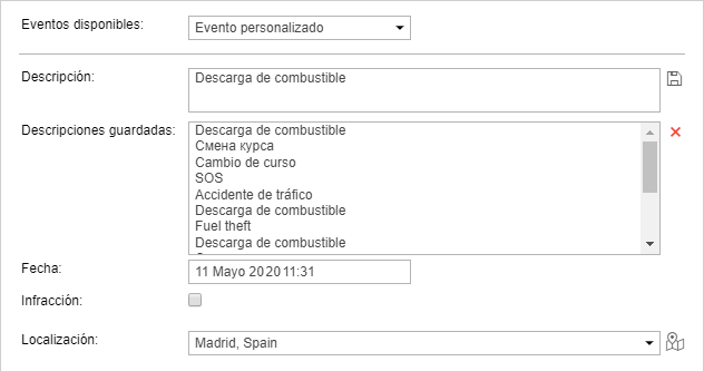 Si marque con un visto la opción Infracción, el evento se registrará en el historial de la unidad como infracción, si no lo hace — como un evento ordinario. Esto significa, que según esta elección el evento figurará en varios tipos de informes: Eventos o Infracciones.