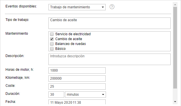 Para registrar un trabajo de mantenimiento, escoja el tipo correspondiente en la lista desplegable de eventos disponibles y llene los campos necesarios.