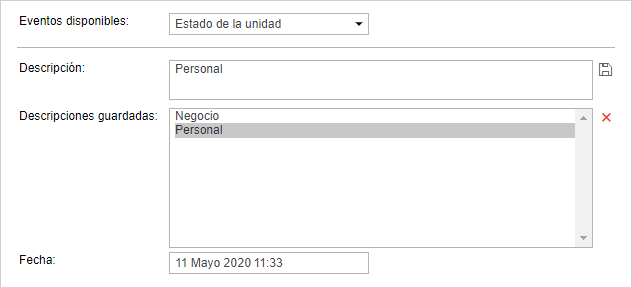 Para registrar el estado de la unidad, introduzca una descripción (puede utilizar las que ha introducido y guardado anteriormente) y, si es necesario, cambie la fecha y hora del estado.