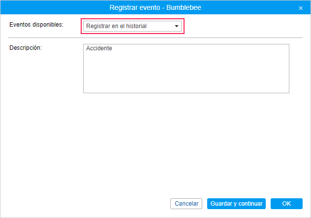 Llene los campos necesarios y apriete OK. Si para una unidad hay que registrar varios eventos, apriete Guardar y continuar. El evento se guardará en el historial (en el rincón izquierdo inferior aparecerá información correspondiente) y se podrá seguir con registrar otro.
