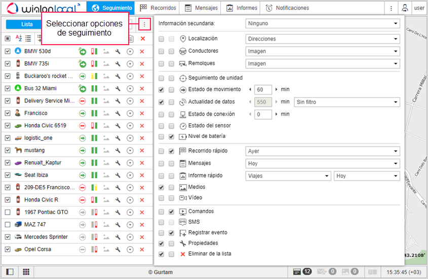 De información. Estas opciones contienen algún tipo de información sobre el estado actual de la unidad (si está moviendo o parada, los valores del sensor, el estado de conexión, la actualidad de datos, la información sobre el conductor, etc.). La información adicional sobre una opción se muestra al apuntársela.