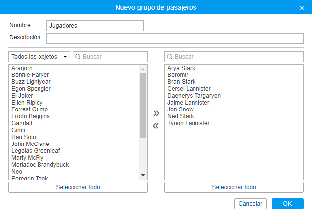 Para crear un grupo, apriete el botón Crear. Introduzca el nombre y la descripción del grupo. Los pasajeros que deben formarlo se escogen en la lista de la izquierda. El contenido de esta lista puede cambiarse por medio de escoger usted en el filtro situado sobre la misma una de las variantes disponibles: todos los objetos, un grupo de objetos (los nombres de los grupos disponibles se muestran entre corchetes) u objetos fuera de grupos. Mueve a los pasajeros necesarios a la lista de la derecha (por doble clics o utilizando el botón Agregar). Apriete OK.