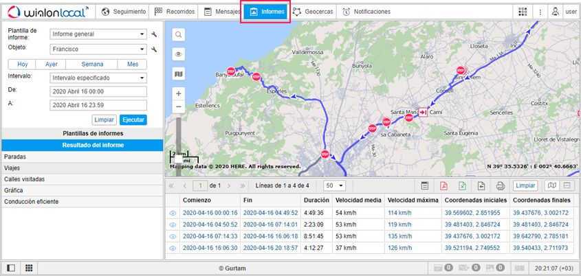 Los informes sobre la actividad de una unidad pueden mostrarse en forma de tablas y gráficas. Se los puede mirar en la ventana del navegador, así como exportar a archivos de varios formatos (PDF, XML, XLS (Excel), HTML, CSV).