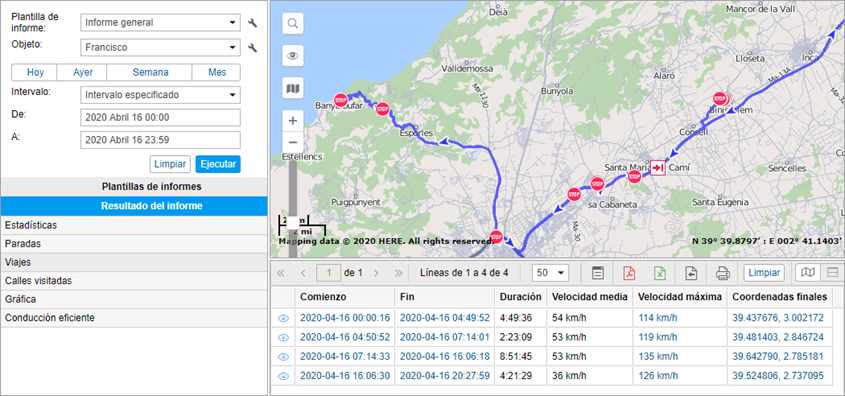 La información del informe puede representarse en forma de tablas o gráficas. Una parte de información puede visualizarse también en el mapa (recorridos de movimiento, varios marcadores).