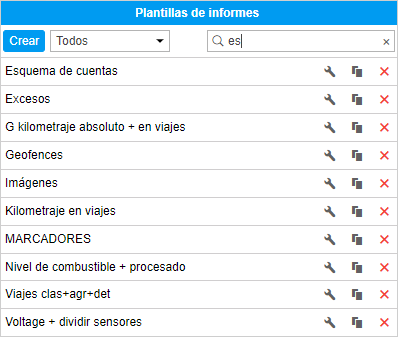 Las plantillas de la lista están ordenadas alfabéticamente. Durante su búsqueda y gestión conviene usar el filtro dinámico. Es bastante, que empiece a introducir el nombre de plantilla en el campo de búsqueda. Los parámetros adicionales de búsqueda se dan en la lista desplegable, donde se puede escoger un recurso o dejar Todos.
