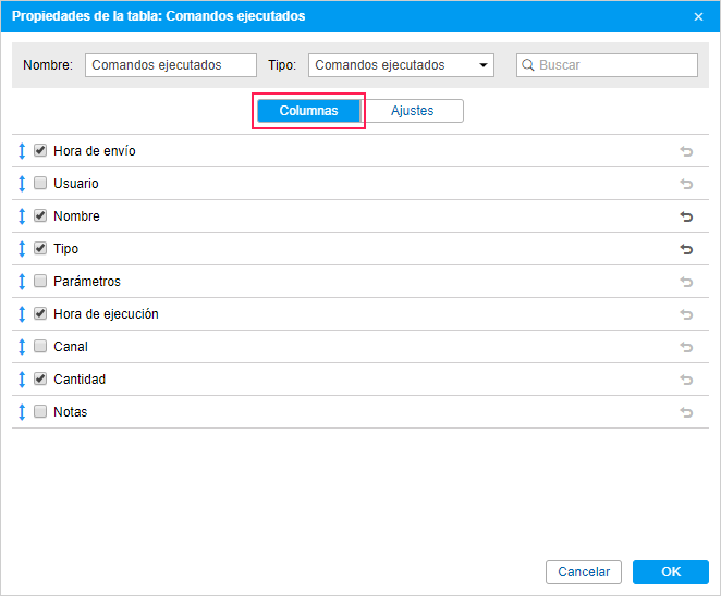 Para cada tabla, además de la selección de columnas, están disponibles los siguientes ajustes que están ubicados en la pestaña del mismo nombre.