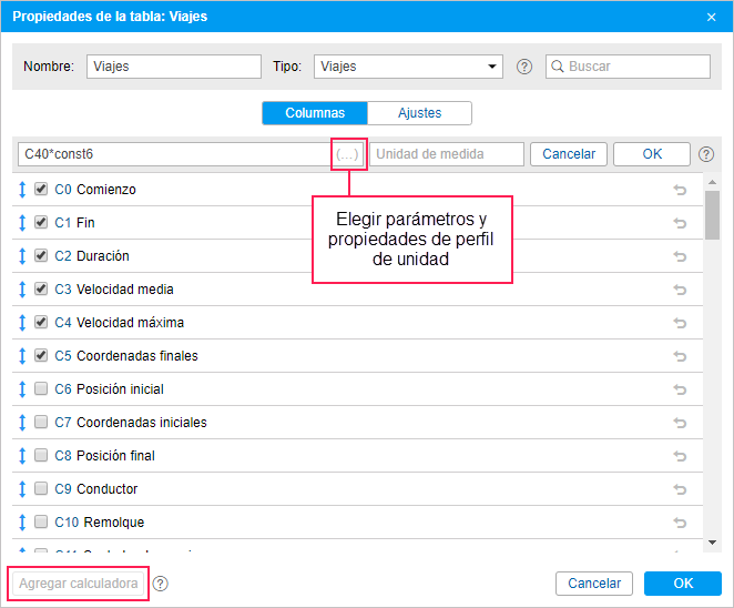 Para agregar una columna personalizada a la tabla, apriete el botón Agregar calculadora e introduzca la fórmula para calcular el valor de la columna. Para hacerlo, puede utilizar: