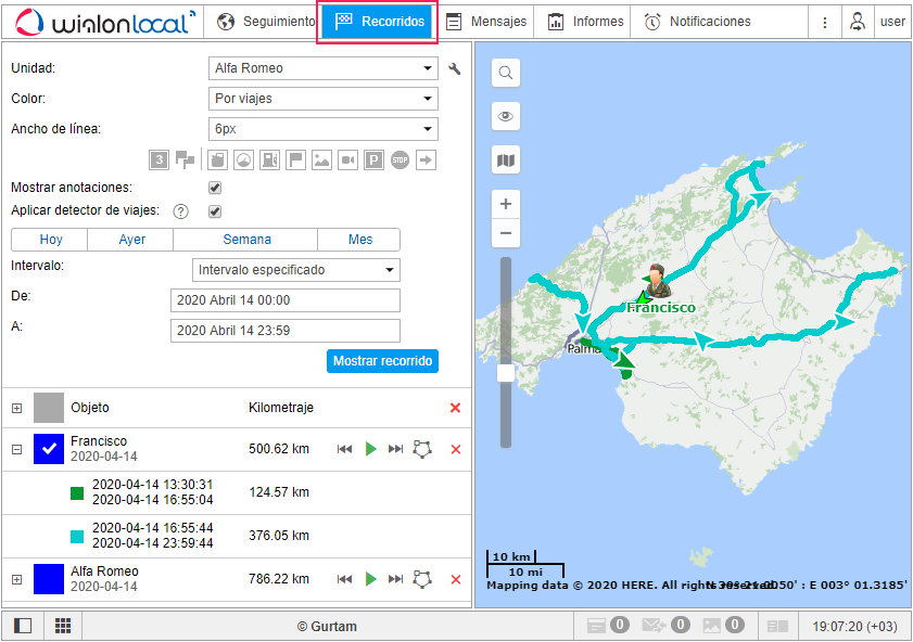 El recorrido es una línea trazada en el mapa que muestra el movimiento de una unidad durante un período determinado. Se construye de acuerdo con los puntos, desde los que la unidad ha enviado mensajes al servidor. Cada punto también almacena los datos y el tiempo de la recepción del mensaje además de otros parámetros (velocidad, sensores, etc.). En los recorridos pueden mostrarse marcadores que indiquen los lugares de llenados de combustible, aparcamientos y otros tipos de acontecimientos.