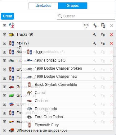 Para crear un grupo apriete Crear, indique las propiedades básicas del grupo y seleccione las unidades que deben formarlo. Apriete OK. El grupo creado se mostrará automáticamente en la lista de trabajo del Panel de seguimiento (en el modo del listado por grupos) de la cuenta donde se ha creado.