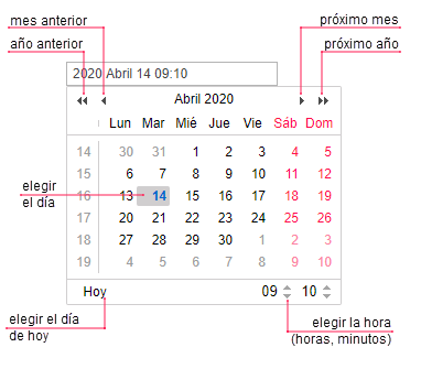 Abra el calendario, ponga el cursor en el campo de introducir la fecha y la hora y haga clic izquierdo. Utilice flechas para escoger el mes y el año. Se puede apretar las flechas o mover la rueda del ratón. Las flechas simples se utilizan para escoger el mes y las dobles — para escoger el año. Una vez elegidos el mes y el año, haga clic en el día necesario. El calendario se cerrará y en el campo de texto aparecerá la fecha escogida.