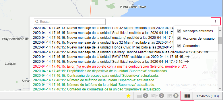 verde: para registros sobre acciones del usuario (creación y modificación de unidades, geocercas, modificación de ajustes, etc.);