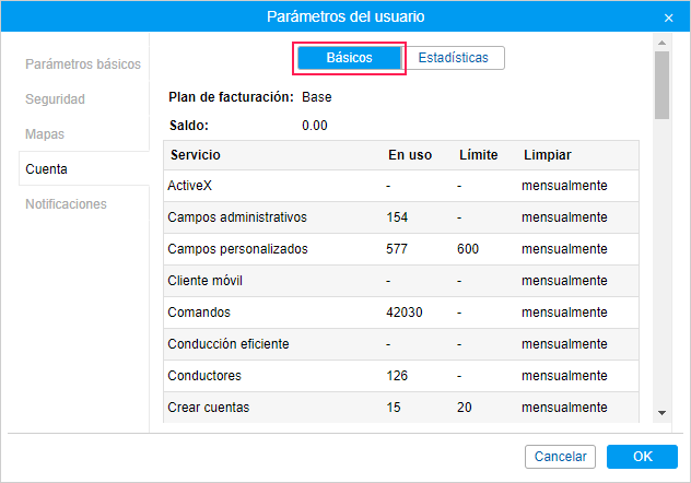 En la sección Básico se muestra el nombre del plan de facturación, el saldo de la cuenta y la tabla de servicios disponibles. La tabla contiene las siguientes columnas.