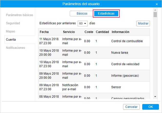 En la sección Estadísticas puede obtener la información sobre los servicios pagados durante un período de hasta 60 días. Para ello, seleccione el intervalo de tiempo necesario y apriete el botón Mostrar.