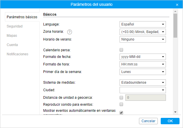 En la primera pestaña de los parámetros del usuario se muestran los parámetros básicos. Aquí puede indicar su zona horaria, elegir el formato de fecha y hora, cambiar la contraseña y ajustar muchos otros parámetros.