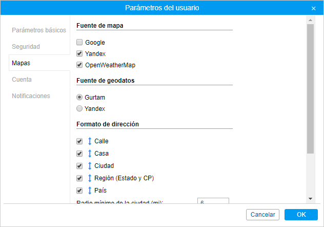 Si está elegido una fuente de geodatos que no es Gurtam, la sección Formato de dirección se hace indisponible.