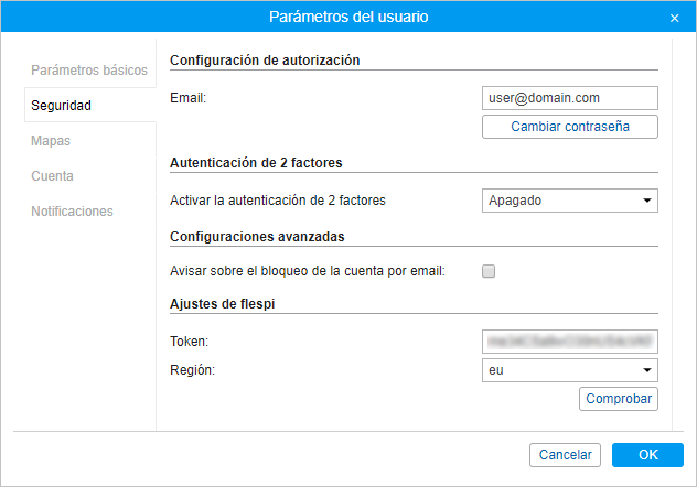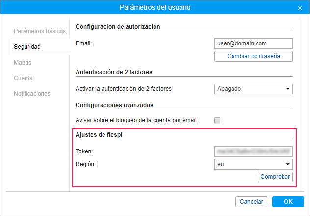 En los parámetros del usuario en Wialon, la región para el token generado se muestra automáticamente. Si introduce el token manualmente, elija la región para el mismo en la lista desplegable.