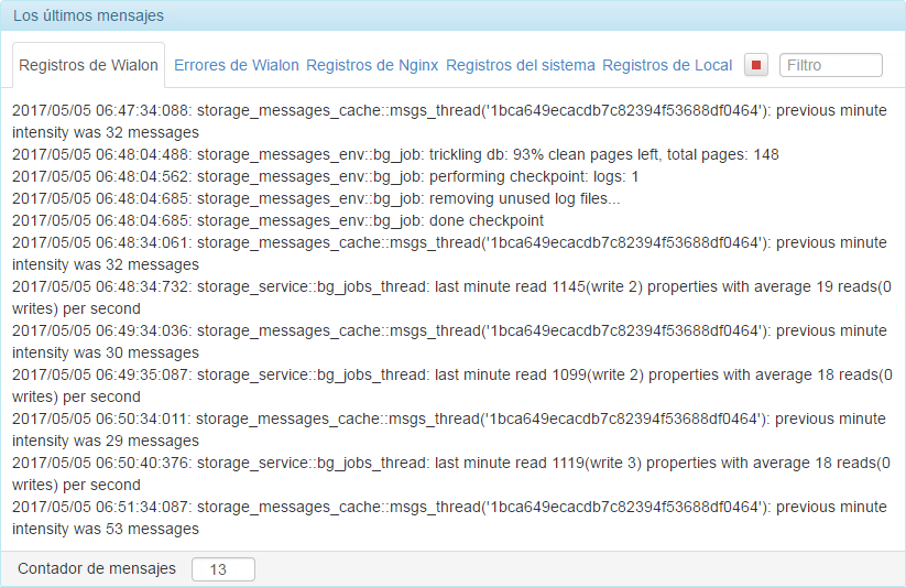 También se puede ajustar la cantidad de líneas que se muestran en el registro. Para hacerlo, introduzca el número necesario en el campo Contador de mensajes situado abajo (equivale a la utilidad tail).